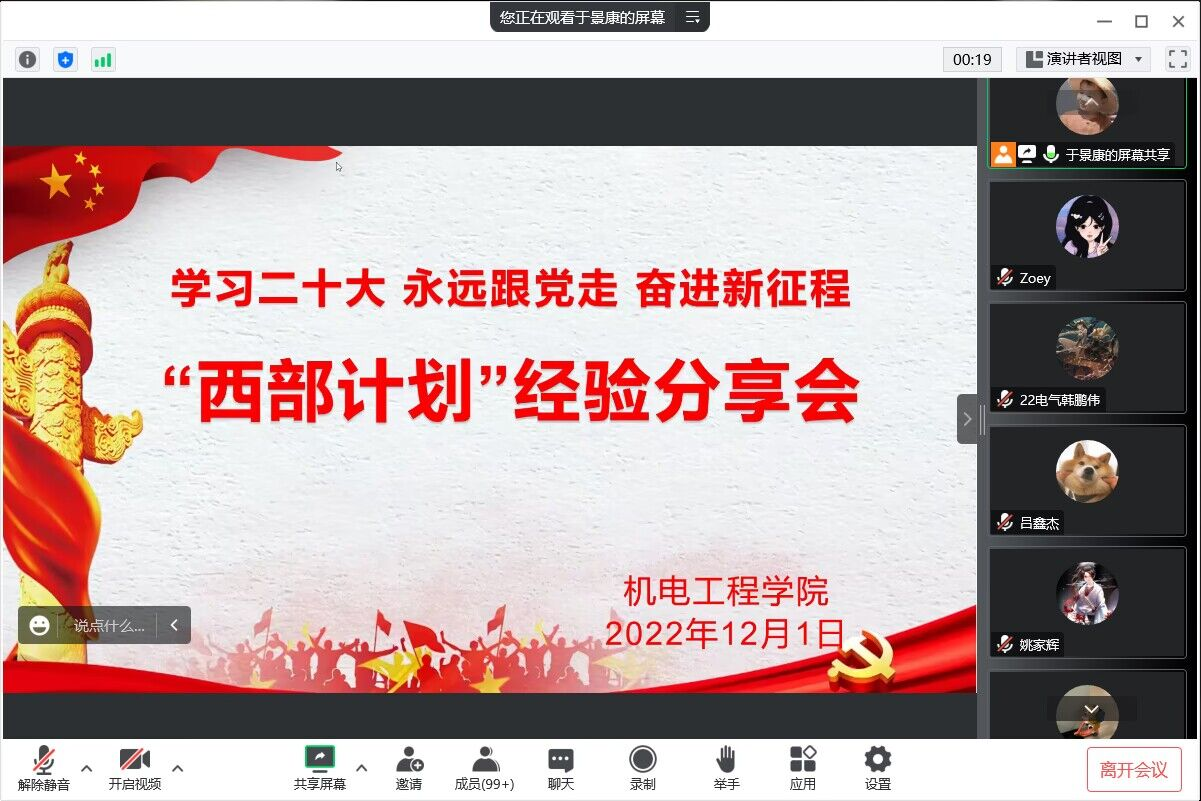 “西部计划”经验交流会邀请我院2022届“西部计划”志愿者讲述在西部的故事,鼓励同学们将个人理想融入到党和国家的事业中,到祖国最需要的地方奉献青春力量。
