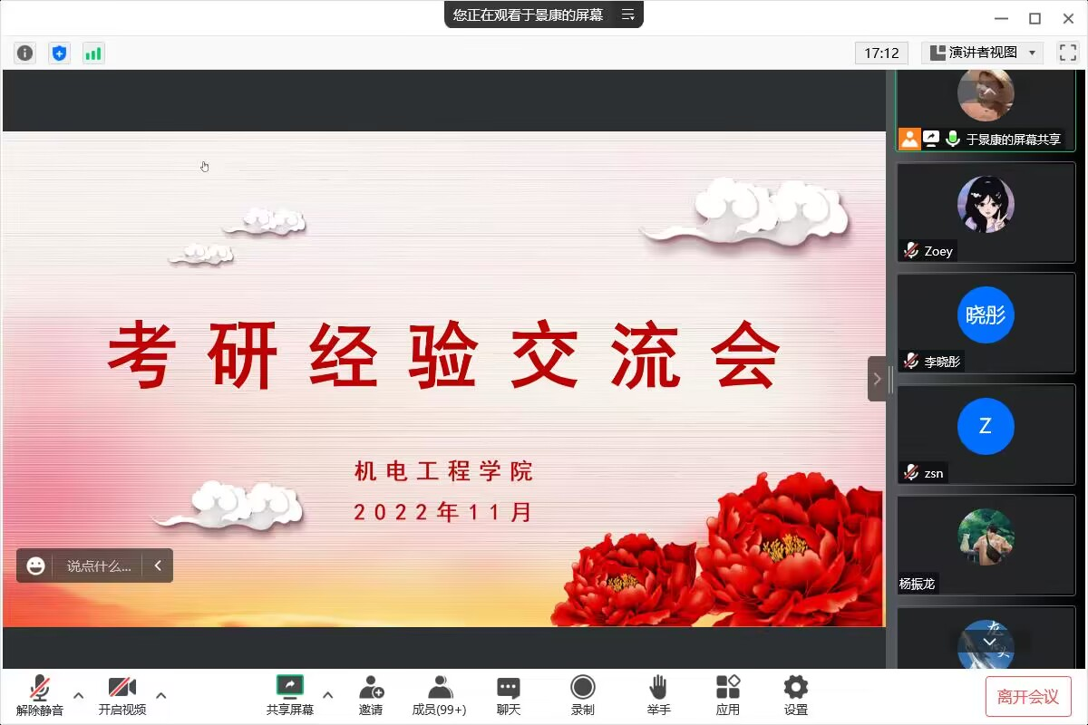 考研经验交流会和升本经验交流会分别邀请考研、升本成功的毕业生代表在线宣讲,分享他们的备考经历、成功经验和学习建议等,帮助同学们了解最新的升学形势,为职业生涯规划提供了重要参考。